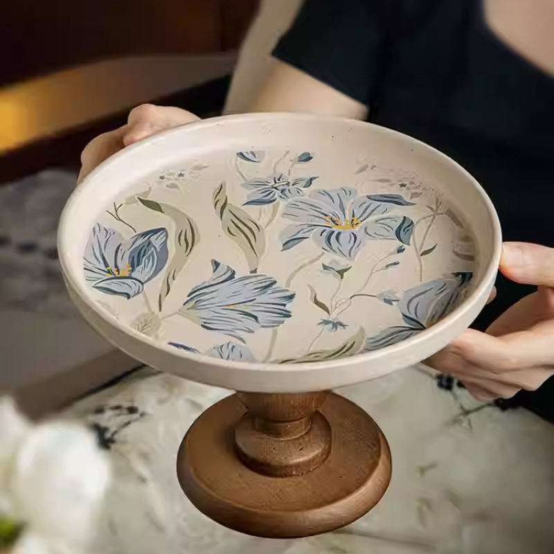 Bring timeless elegance to your home with this Chinese Style Wooden High-Foot Ceramic Tray. Featuring a durable ceramic plate set on a wooden high-foot base, this tray is perfect for serving fruits, snacks, or as a sophisticated coffee table centerpiece. Its versatile design also makes it ideal for jewelry storage or decorative use, blending traditional Chinese aesthetics with modern living.