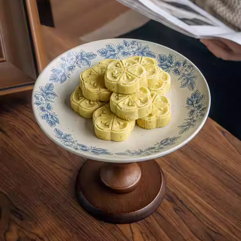 Medieval Blue and White Wooden Fruit Plate Ceramic High-Footed Plate Pastry Tray
